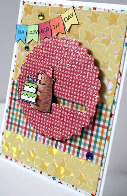 I created this card using the Birthday Bears Stamp Set.  I first stamped all of the images on separate card stock and colored them in with Copic Markers.  I then fussy cut them and went over the edges with a black marker and set them to the side.  I then looked in my scrap bin and grabbed random paper (which all happened to be from DCWV) that I thought would work perfectly with my party scene.  I also grabbed this circle die cut out of my scrap box and thought it would be perfect to do my slider on it.  (My slider is made with a die from the stitched tags set by MFT!)  I layered everything together, layered the slider area with double foam adhesive and a penny to put it all together.  I then finished it off with some colored gems.